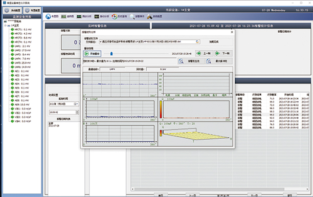 综合监测后台具备局部放电图谱的展示功能,装置告警后应可调取告警前一个周波起的1个工频周期时长的时域波形,以及告警前后各30分钟内的局放图谱。