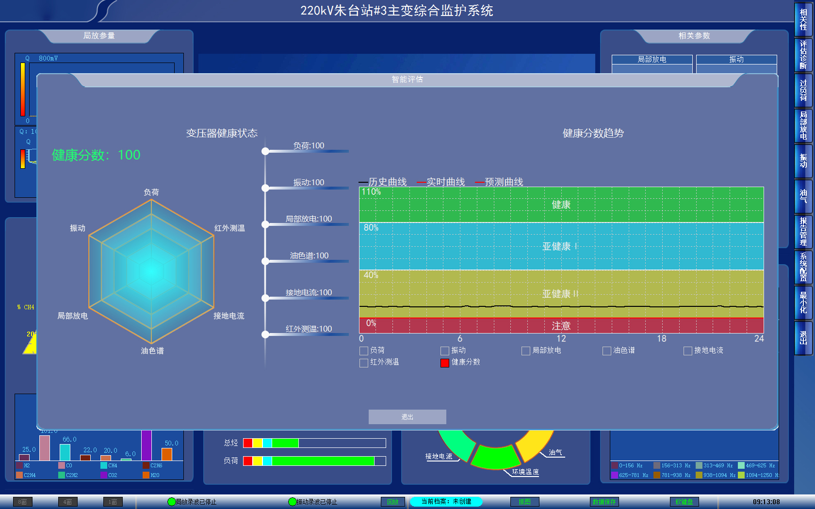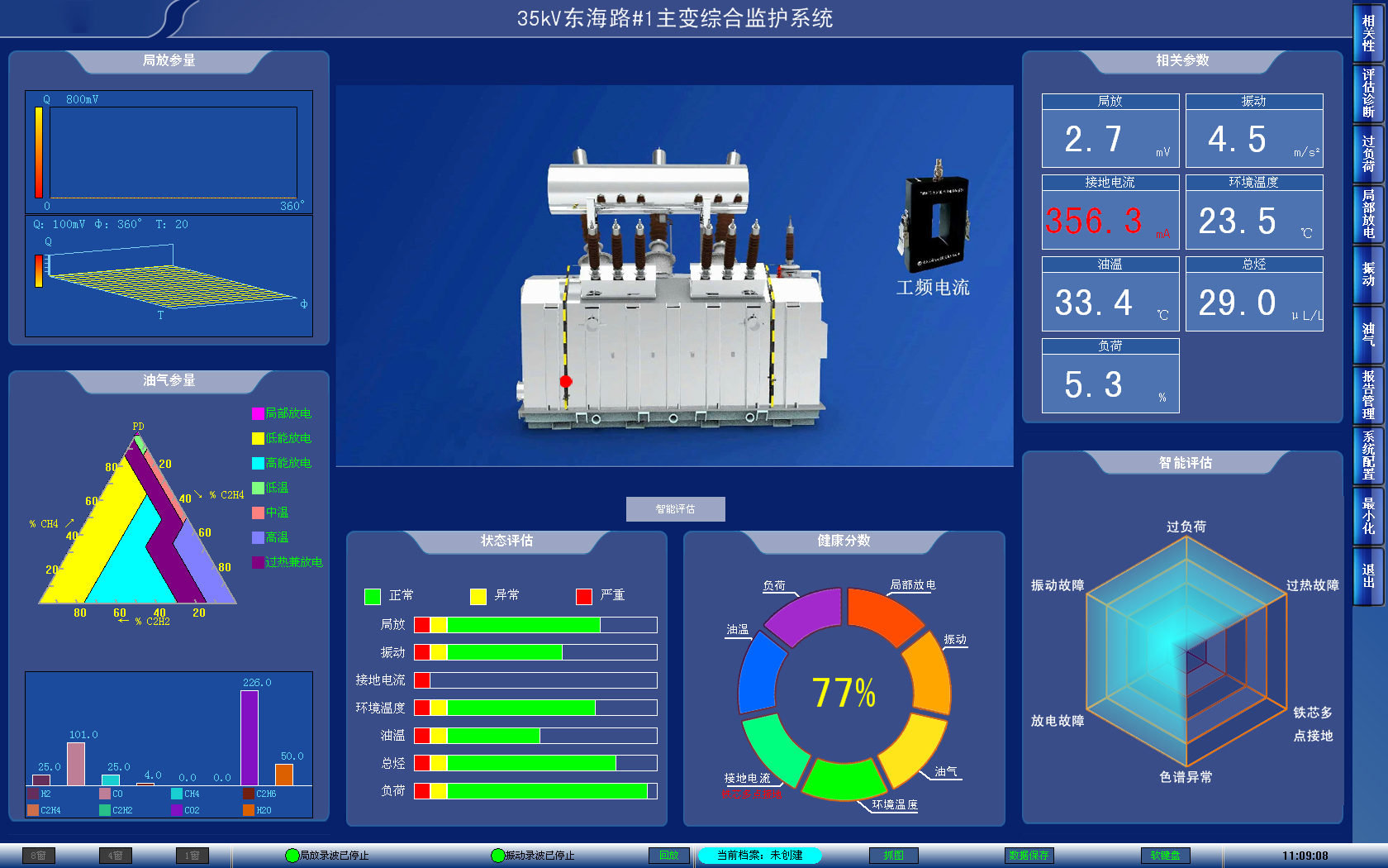 1、综合评估:变压器多元参量数据融合,实时自动评估诊断运行状态,三维可视化显示,智能报警;